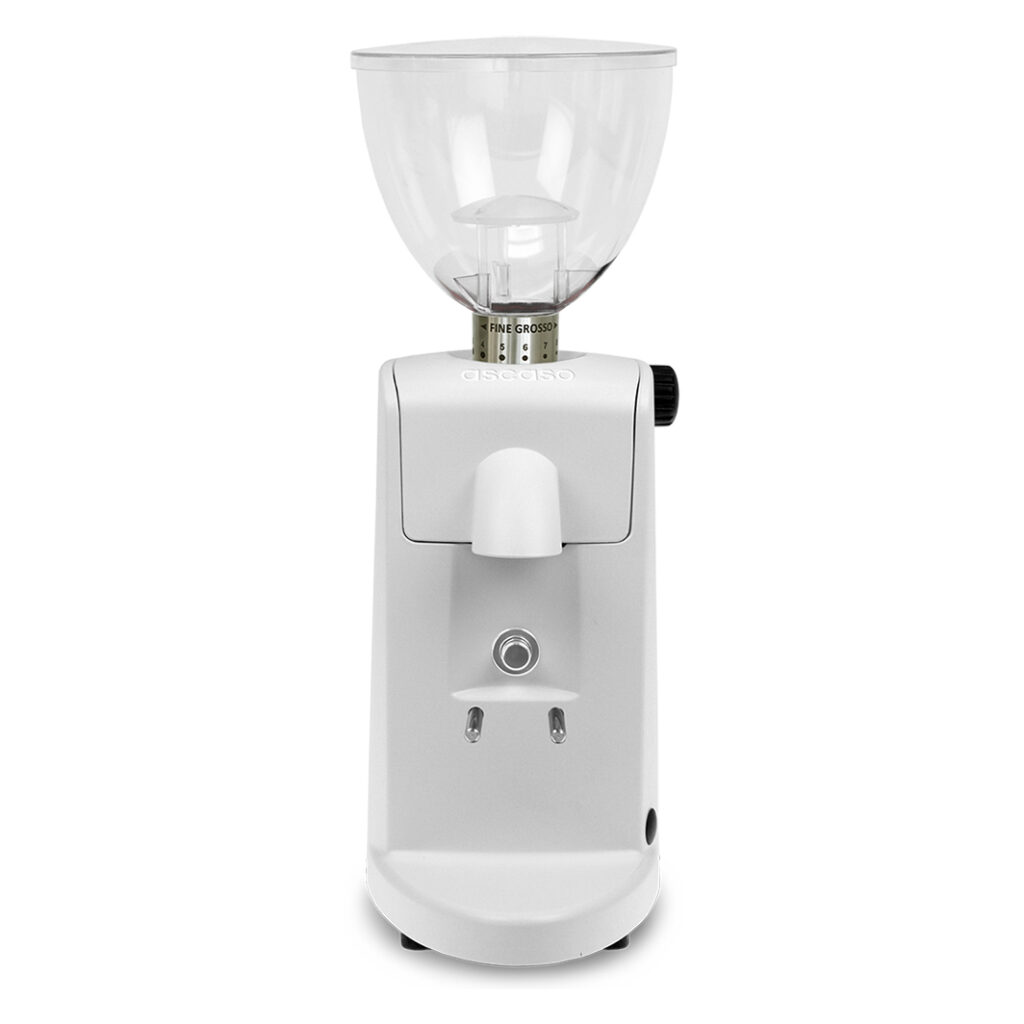 Die iMINI ist eine ausgesprochen ansprechend gestaltete Espressomühle für den heimischen Anwendungsbereich. In Größe, Leistung und Qualität stellt sie die ideale Ergänzung zu den ascaso Maschinen, aber auch den Produkten anderer Hersteller dar. Das Gehäuse aus Druckguss-Aluminium ist perfekt austariert, so dass der Siebträger bei leichtem Druck den Mahlvorgang in Gang setzt, ohne dass die Mühle ihre Standposition verliert. Dank der vier Farbvarianten: Alu poliert, Schwarz, Weiss und Rot, kann man mit der iMINI auch optisch Akzente setzen. Für den kleineren Geldbeutel bietet ascaso die iMINI in allen Gehäuse-Varianten auch mit Kegelmahlwerk (i2) an.