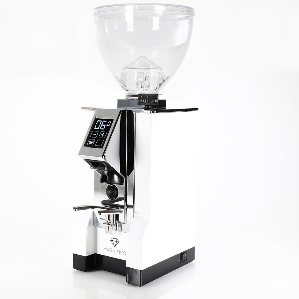 Die EUREKA MIGNON MAGNIFICO ist die Top- Mignon, die exklusiv nur von Fachhändlern des Espresso Partner Pool Netzwerks angeboten wird. Das Scheibenmahlwerk ist mit einer patentierten 55 mm Diamond Inside Hochleistungsmahlscheibe bestückt, die eine höhere Produktivität und Haltbarkeit aufweist als Standardmahlscheiben und dazu noch eine gleichmäßigere Granulometrie über die Nutzungszeit gewährleistet. Über das Touch-Display können zwei unterschiedliche Portioniereinstellungen programmiert werden und einen manuellen Modus gibt es auch. Die mikrometrische Mahlgradeinstellung erfolgt stufenlos über das angenehm große Drehrad. Natürlich verfügt sie auch über die ACE Technologie, gegen Verklumpen und elektrostatische Aufladung des Mahlguts.